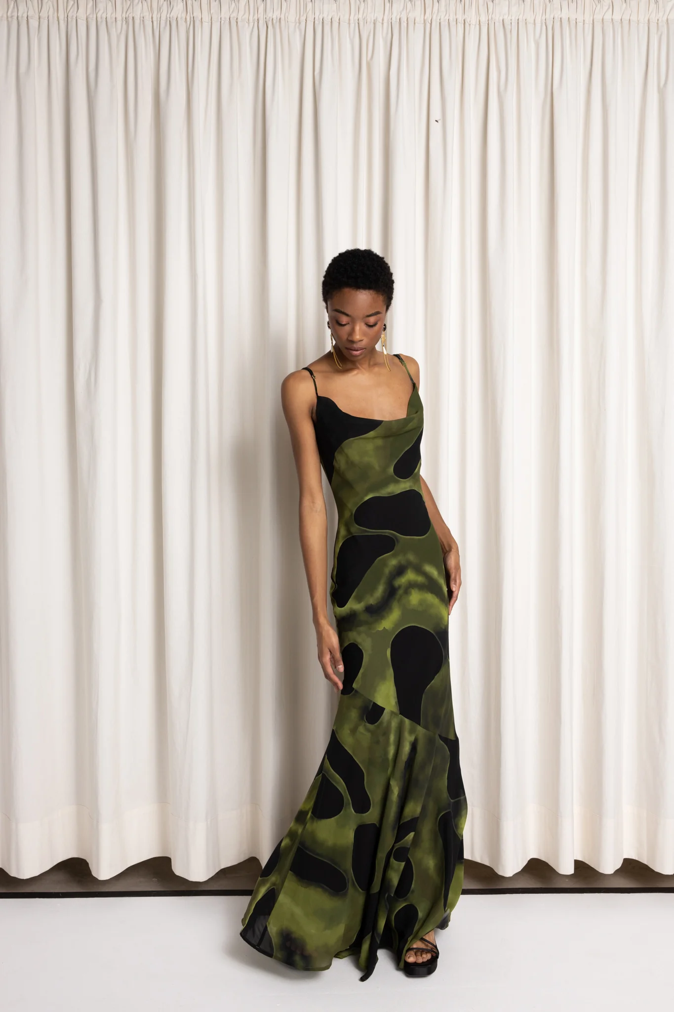 Μακρύ φόρεμα από τη συλλογή The Power Within, με μεταξένια υφή και έντονο τύπωμα σε λαδί και μαύρους τόνους. Αγκαλιάζει με χάρη το σώμα, αναδεικνύοντας τη θηλυκότητα και την εσωτερική δύναμη μέσα από ρευστές γραμμές και αβίαστη κίνηση.
