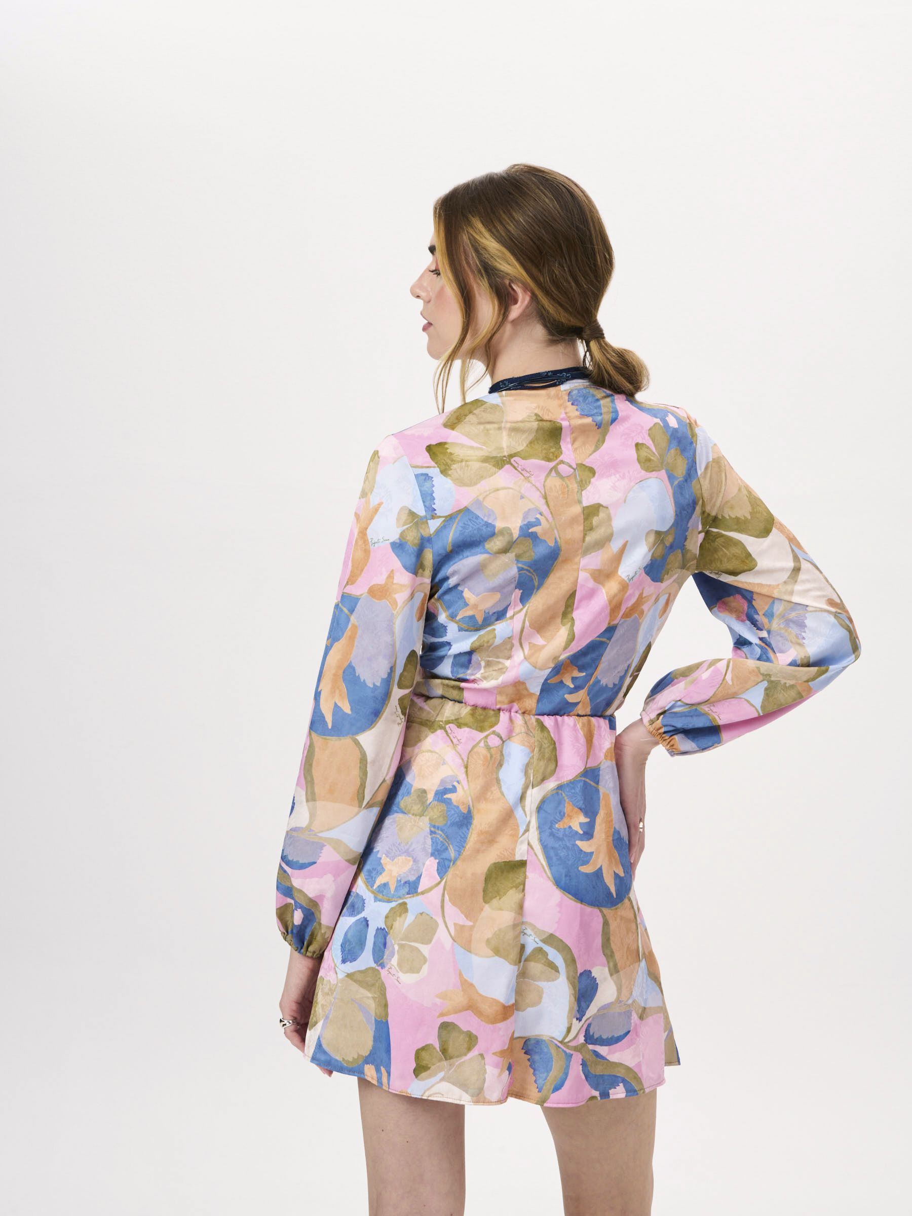 Το PROJECT SOMA Kailani Dress κατασκευάζεται από ζακαρ σατέν ύφασμα με ιδιαίτερο τύπωμα. Mini κλος φόρεμα που δένει μπροστά.